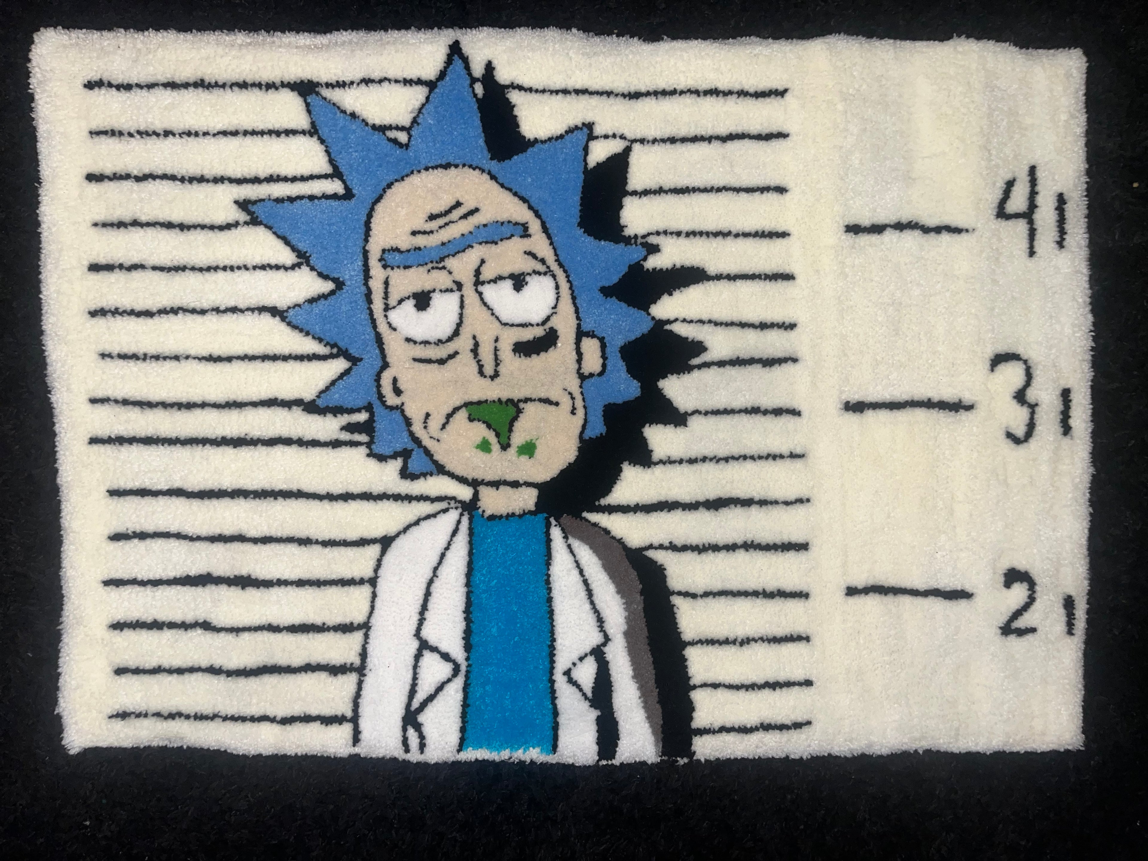 Rick Mug Shot: A wild, hand-tufted tribute to everyone’s favorite chaotic genius. Blue hair spiked, drool dripping, attitude intact. Perfect blend of humor, rebellion, and cartoon culture for bold spaces.