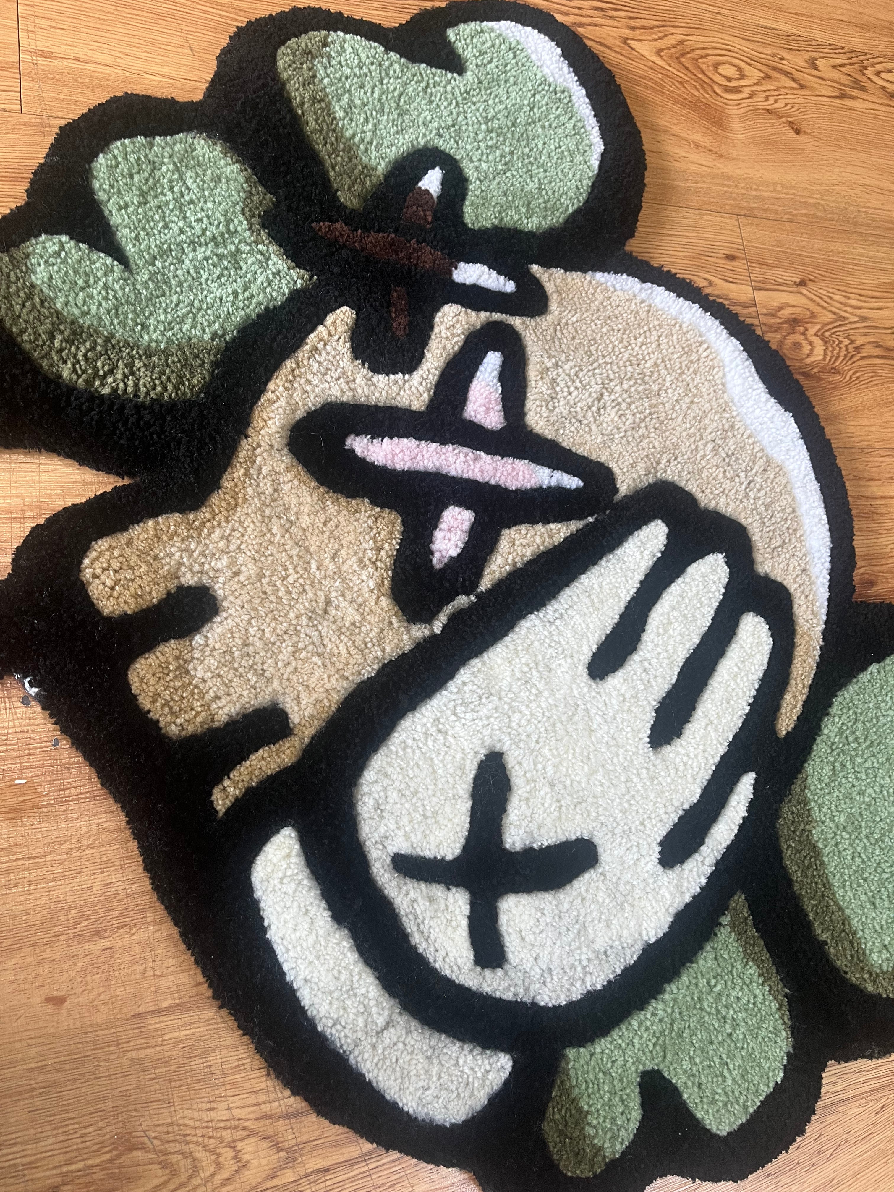 1Eyed Kaws is a bold, hand-tufted statement piece blending street art and rebellion. With one eye X’d out and a gloved hand in prayer, he represents imperfection, creativity, and the power of standing out.